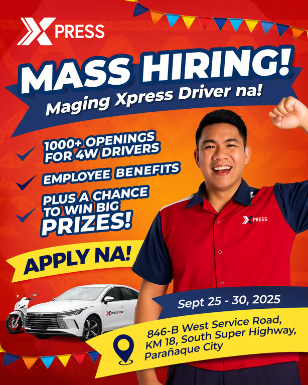 Last Chance to Drive Your Future! From September 25–30, 2025 (9 AM–4 PM), the Xpress Super App Activation & Training Center in Parañaque will host its final mass hiring of the year. Qualified drivers with a Professional Driver’s License (2W or 4W) can walk in and get hired the same day. No vehicle? Xpress has programs to get you on the road fast. Earn up to ₱30,000 monthly, enjoy full benefits, and join the raffle for smartphones and a brand-new motorcycle. Six days only — miss this, and you miss out!